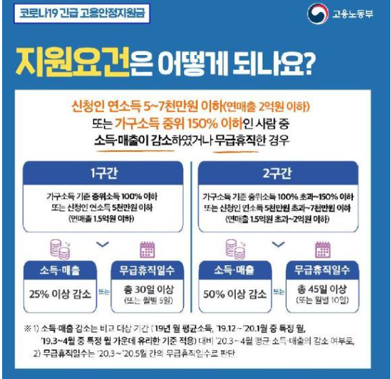 * 2019년 12월~2020년 1월 대비 소득/매출 감소율을 비교하고, 무직휴급자의 경우 휴직일수가 30~45일이상인 경우 지원금을 받을 수 있습니다.