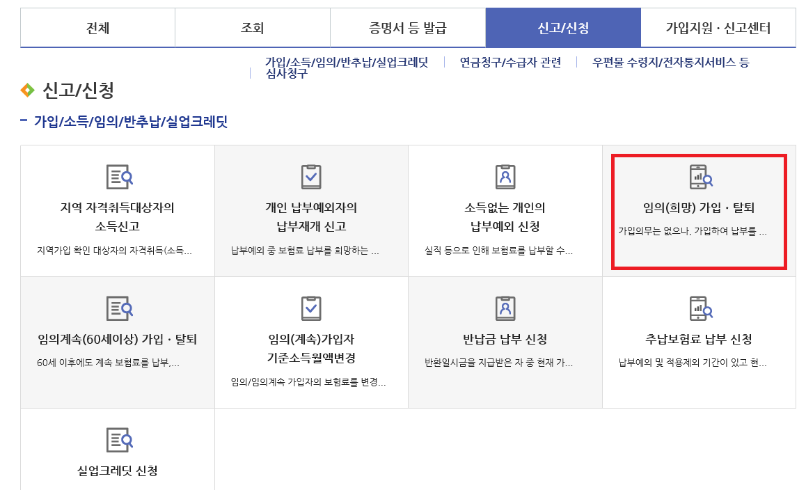5. [임의(희망)가입/탈퇴] 메뉴를 선택합니다.