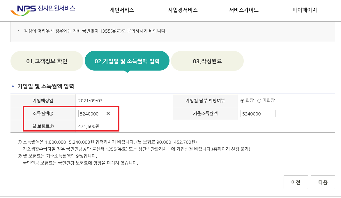 7. 소득월액, 기준소득월액을 기입합니다. (소득월액에 따라 국민연금 월납입액이 결정됩니다.)