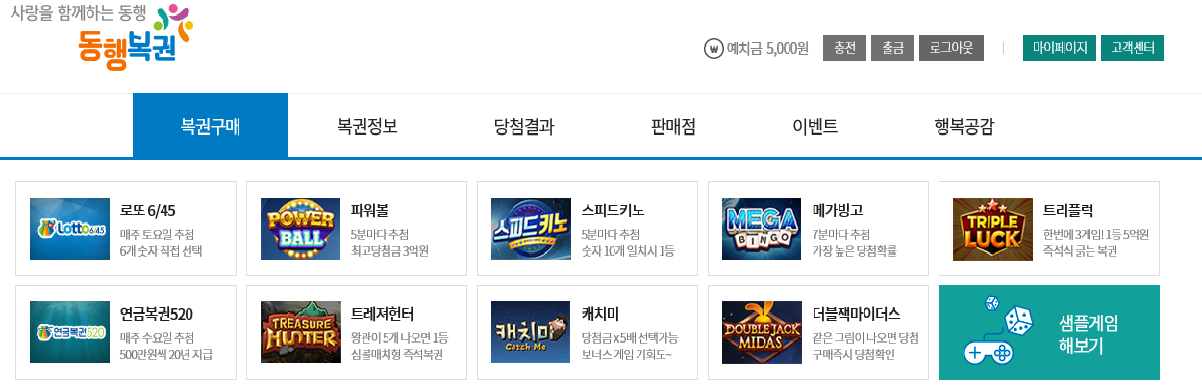 - 온라인에서 복권을 구매하기 위해서는 '예치금'을 미리 충전하여야 합니다.