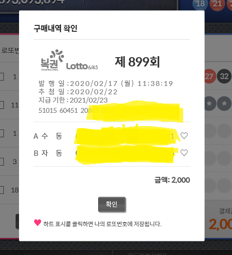 저는 2주 전에 로또 6/45 897회차 복권을 2매 구매했는데요, 결과는 '낙첨'입니다.