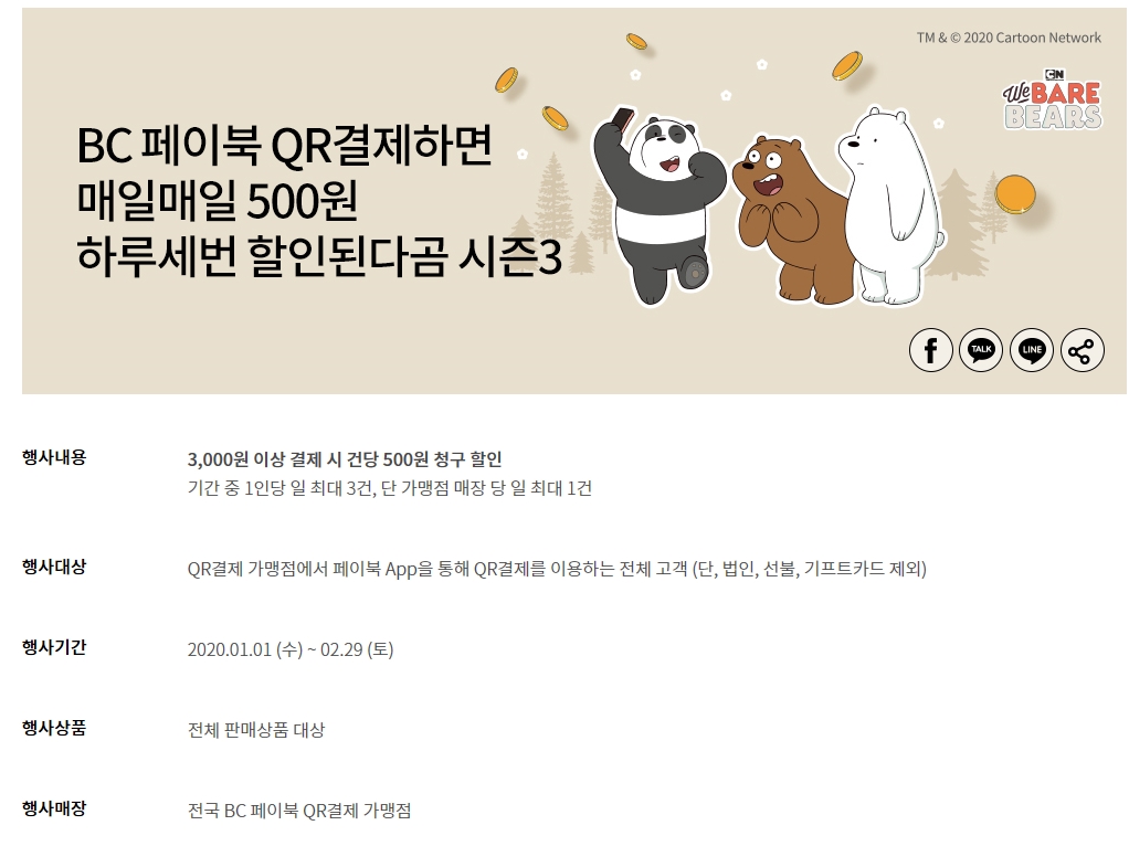 - BC카드 페이북 QR 결제 시 청구 할인 (2월 현재 3,000원 이상 구매 시 500원 할인 * 일 3회)