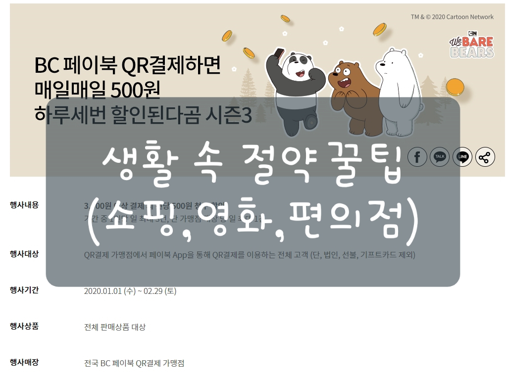 - BC카드 페이북 QR 결제 시 청구 할인 (2월 현재 3,000원 이상 구매 시 500원 할인 * 일 3회)