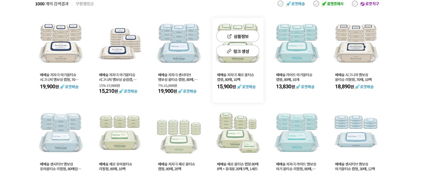 아래와 같이 판매중인 물티슈 내역이 보이고, 정보 위에 마우스 커서를 가져가면 [링크 생성]이라는 것이 보입니다.