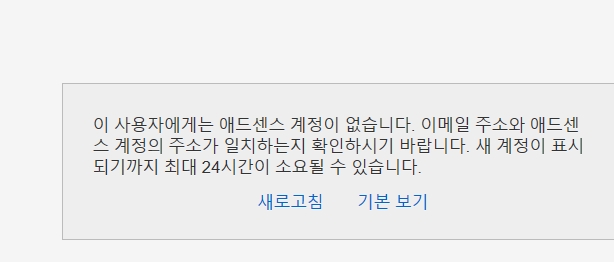 "이 사용자에게는 애드센스 계정이 없습니다."라는 팝업창이 보인다면