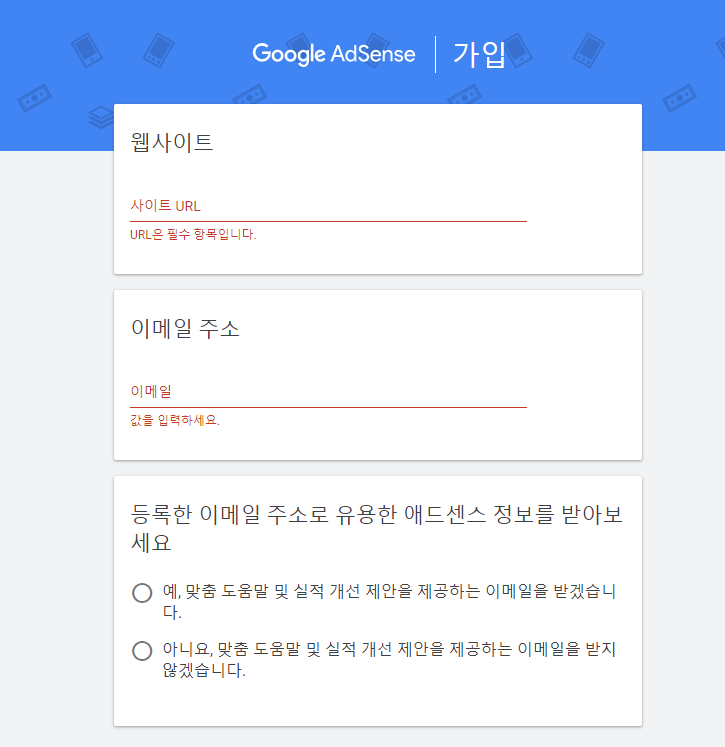 가입신청서에 티스토리 블로그 주소와 애드센스 관련 내용을 안내받을 이메일 주소를 입력하고 나면,