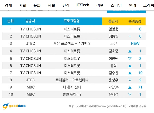 특히나 출연자 화재성 부문에서 임영웅이 지난 주와 동일하게 1위를 기록하였습니다!