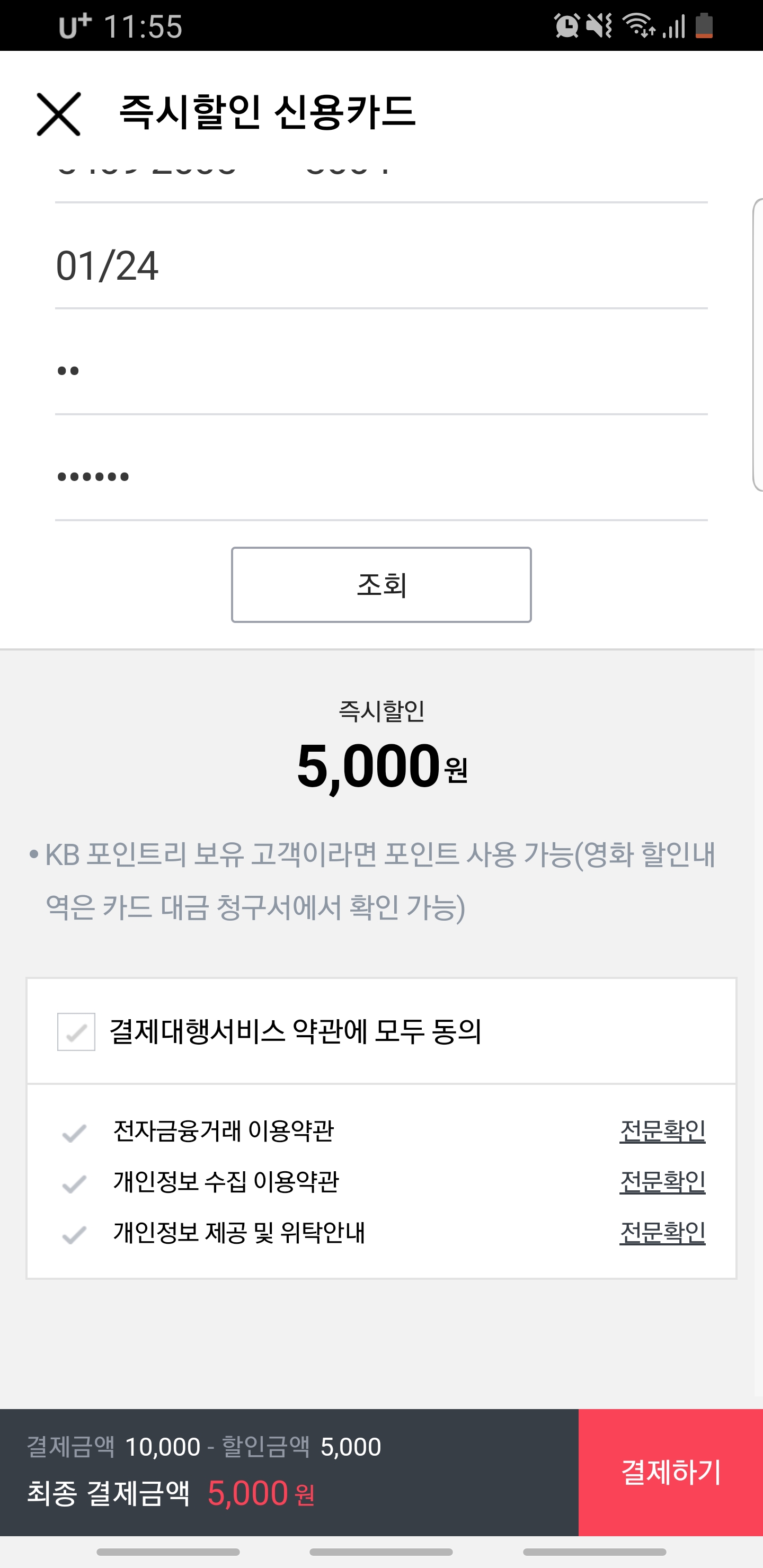 카드정보(번호, 유효기간, 비밀번호, 생년월일)을 입력하면 즉시할인 5,000원이라고 뜨고,