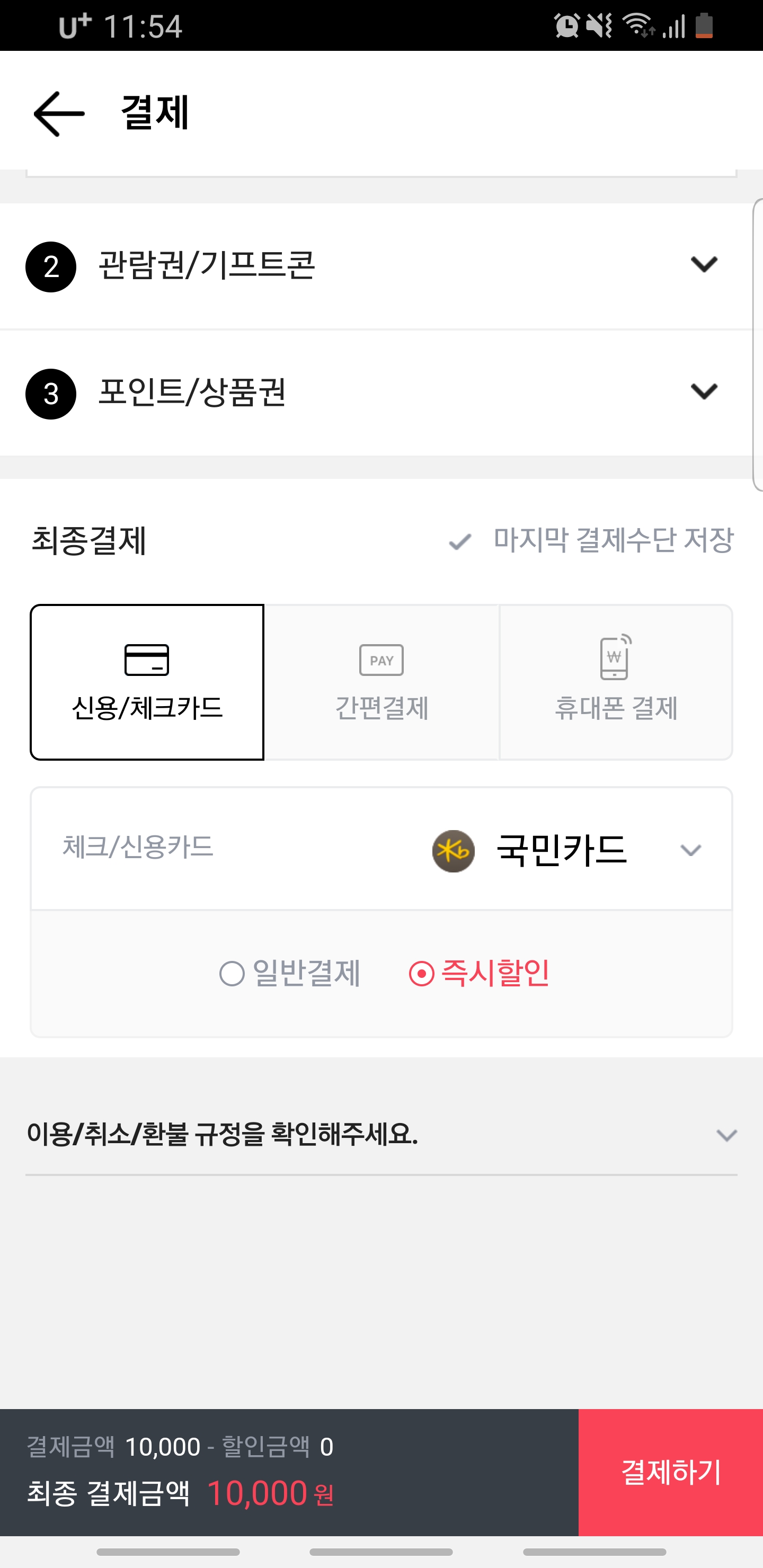 - 적용방법 : 영화 예매 후 결제 창에서 [신용/체크카드] - [국민카드]를 선택 하며 아래와 같이 일반결제와 즉시할인을 선택 할 수 있는 창이 나옵니다. 이 때, 즉시할인에 체크를 하고 결제하기를 누르고