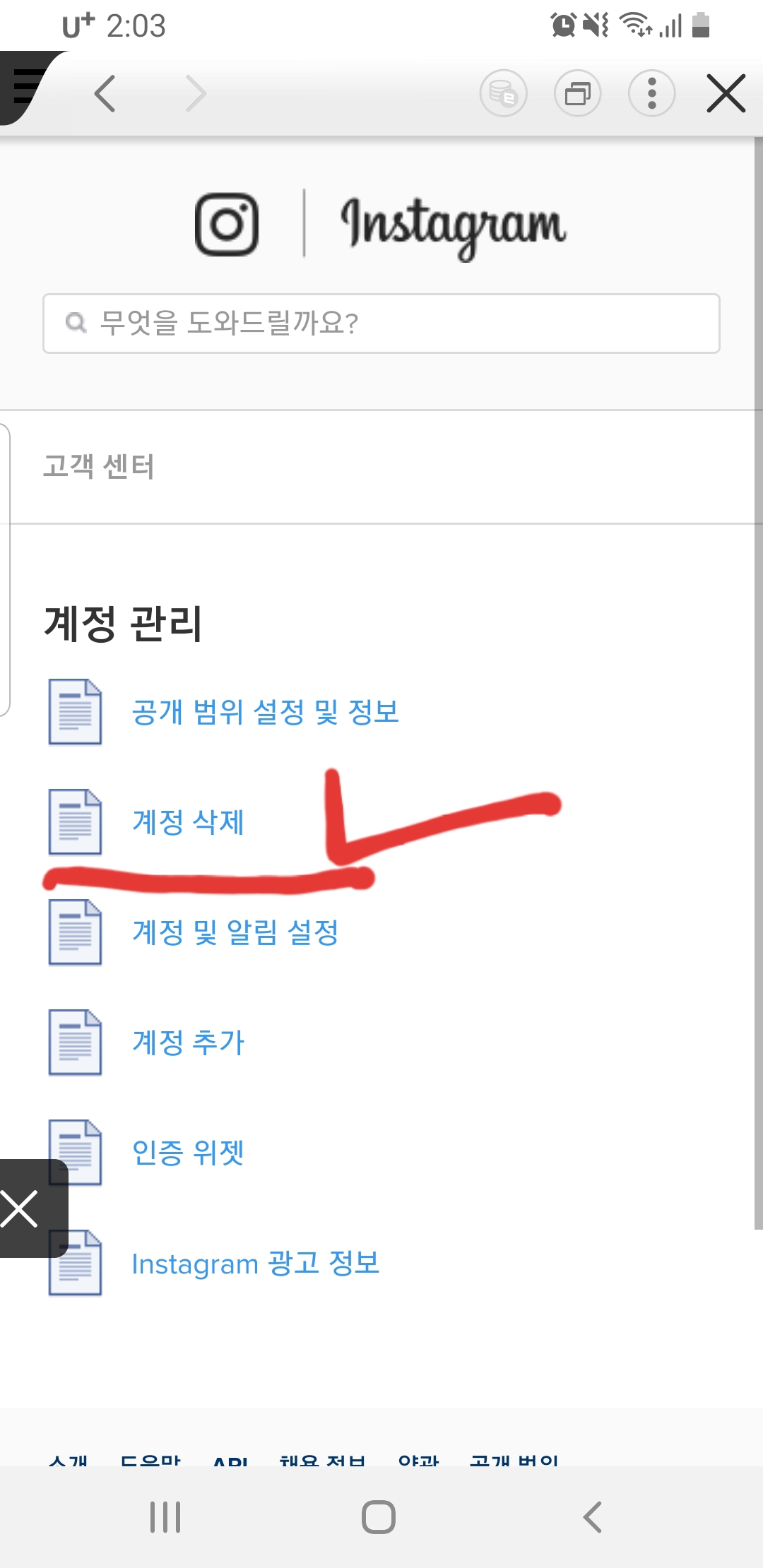 [설정]으로 들어가서 [도움말]을 클립합니다. 사실 좀 의아한 것이 계정 관련 탈퇴이면 당연히 [계정]으로 들어가서 찾는 사람들이 대부분 일텐데 의도적으로 여기에 숨겨 둔 것이 아닌가 의심스럽습니다.