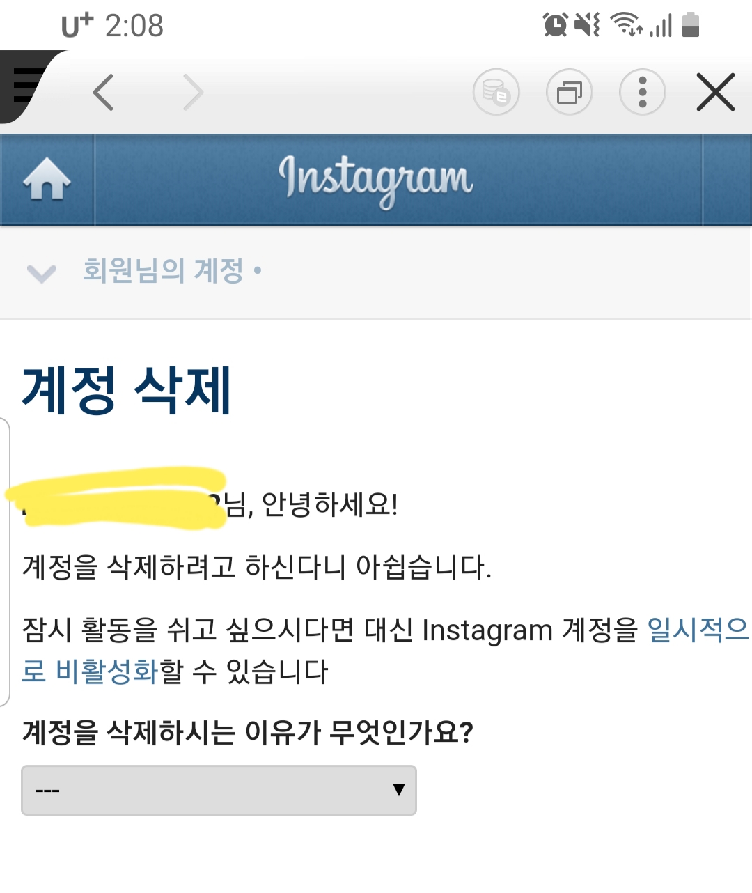 마지막으로 정말 인스타그램 계정을 삭제하려고 하는거냐, 일시적으로 비활성화 할 수 있다고 애원합니다.