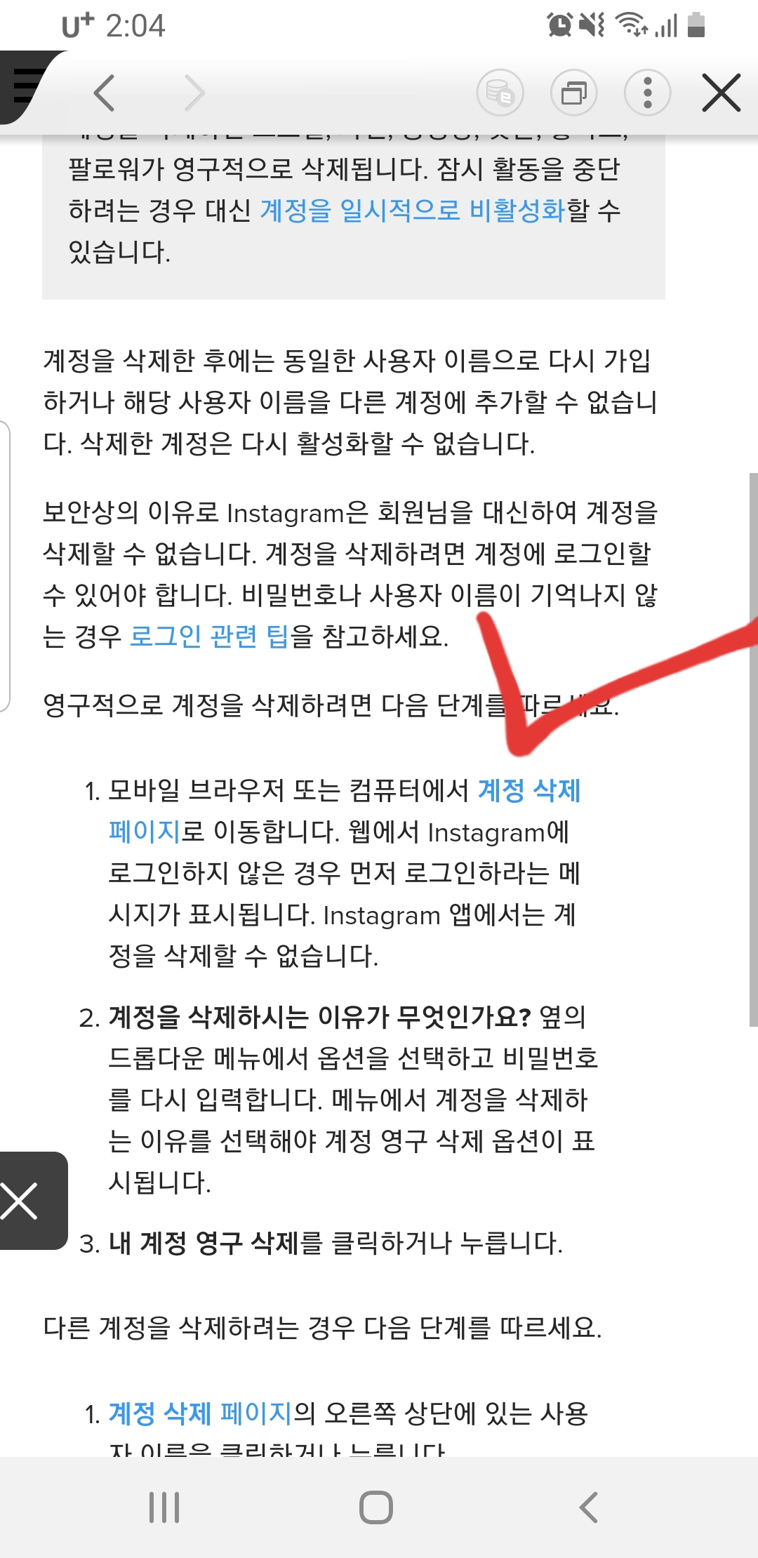 3. [계정관리]에 보면 [계정삭제]가 있고, 이걸 클릭하면, 계정을 일시적으로 비활성화 할건지 삭제할건지 한번더 매달립니다. 여기서 흔들리지 말고 '내 instagram계정을 삭제하려면?'을 클립합니다.